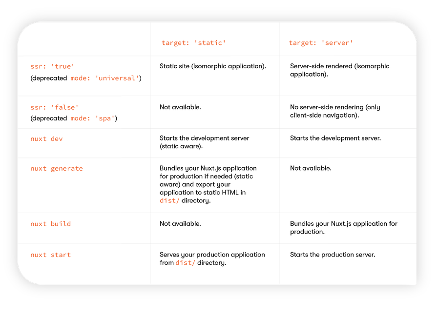 Also, there are several commands available out of the box by Nuxt.js. Some of them are available with some deployment targets only. Moreover, the table below shows the possible target, mode and ssr combinations with the respective result application.