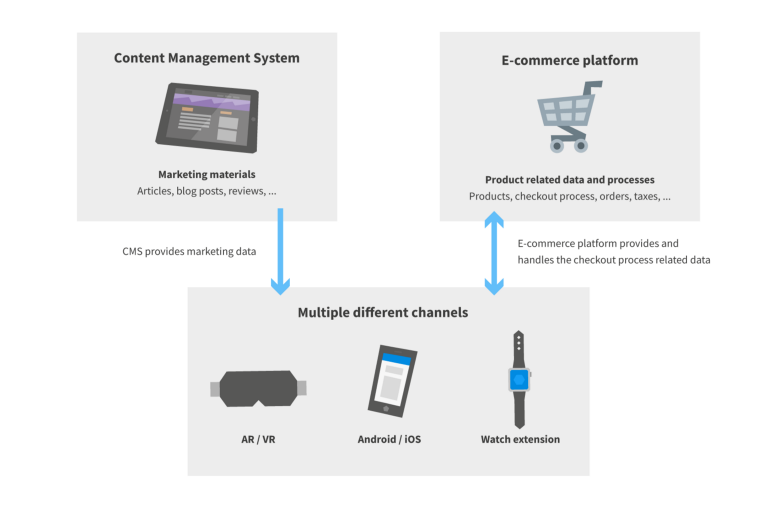 Concerns are separated as in the previous example, content in CMS, product data in an e-commerce platform. The difference is in merging these two data sources on the client’s website, mobile app, or server. A good example of such a platform could be commercetools. This platform provides comprehensive APIs and SDKs for various platforms. Combining the SDK of commercetools and CMS is just an ordinary daily task for a developer. It’s only up to you how to merge commercetools’ features with your content. And what’s the benefit for all your effort of custom implementation and struggling with new SDKs and APIs? Tailor-made final behavior on your site or maybe a mobile app in addition to numerous sexy things like chatbots, watch extensions, or augmented reality!
