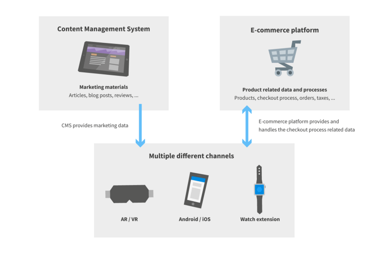 Concerns are separated as in the previous example, content in CMS, product data in an e-commerce platform. The difference is in merging these two data sources on the client’s website, mobile app, or server. A good example of such a platform could be commercetools. This platform provides comprehensive APIs and SDKs for various platforms. Combining the SDK of commercetools and CMS is just an ordinary daily task for a developer. It’s only up to you how to merge commercetools’ features with your content. And what’s the benefit for all your effort of custom implementation and struggling with new SDKs and APIs? Tailor-made final behavior on your site or maybe a mobile app in addition to numerous sexy things like chatbots, watch extensions, or augmented reality!
