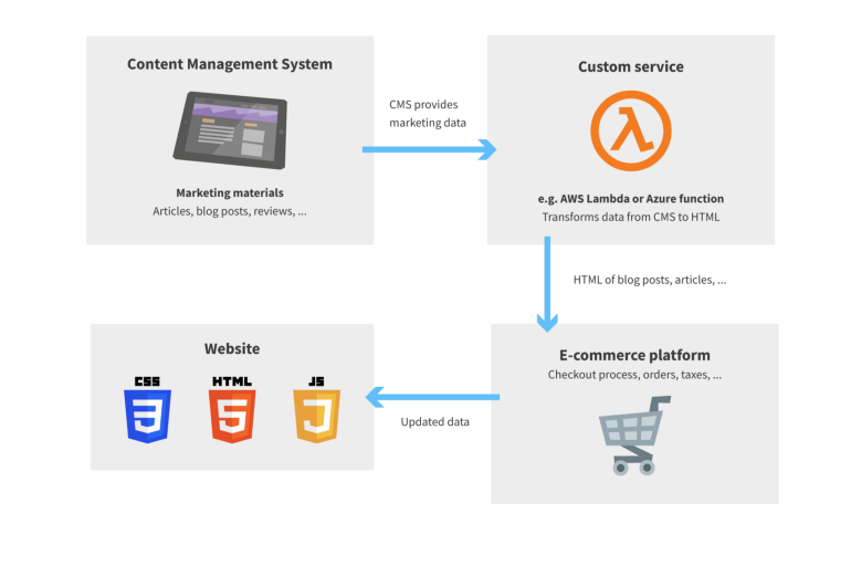 E-commerce capabilities are an essential part of many websites. In the old (monolithic) days, we had one content management system (with a built-in e-commerce platform) which ruled the whole website, however, the times are changing. We are moving from monolithic systems to microservices and this transformation bears fruit.