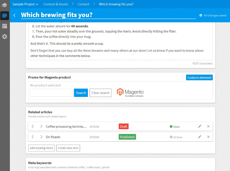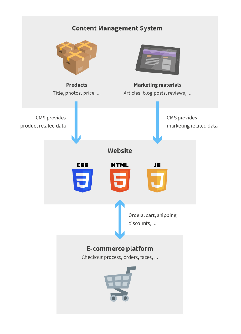 Strange as it may sound, managing product data in your content management system is not a bad idea at all. The scenario is pretty straightforward — your content, articles, and marketing data is handled by your content management system, although orders, shipping data, discounts, and all checkout process related data is handled by an e-commerce platform. And what about goods? In the content management system as well!