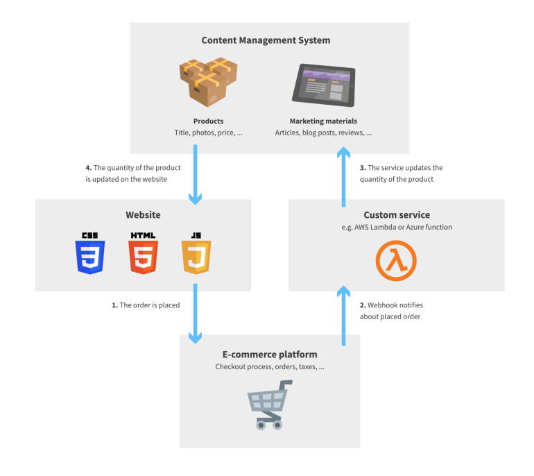 One might be also wondering if it’s possible to sync data between the content management system and e-commerce platform — for example, the count of products in the CMS. With a little assistance from webhooks and write API it is a pretty legitimate scenario. After an order is placed, the e-commerce platform sends a webhook request to your service and it updates product quantity directly in your CMS. Simple, right?