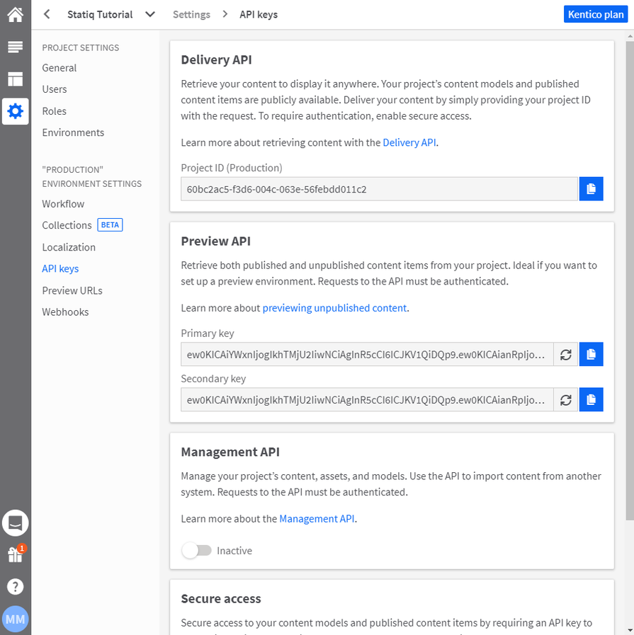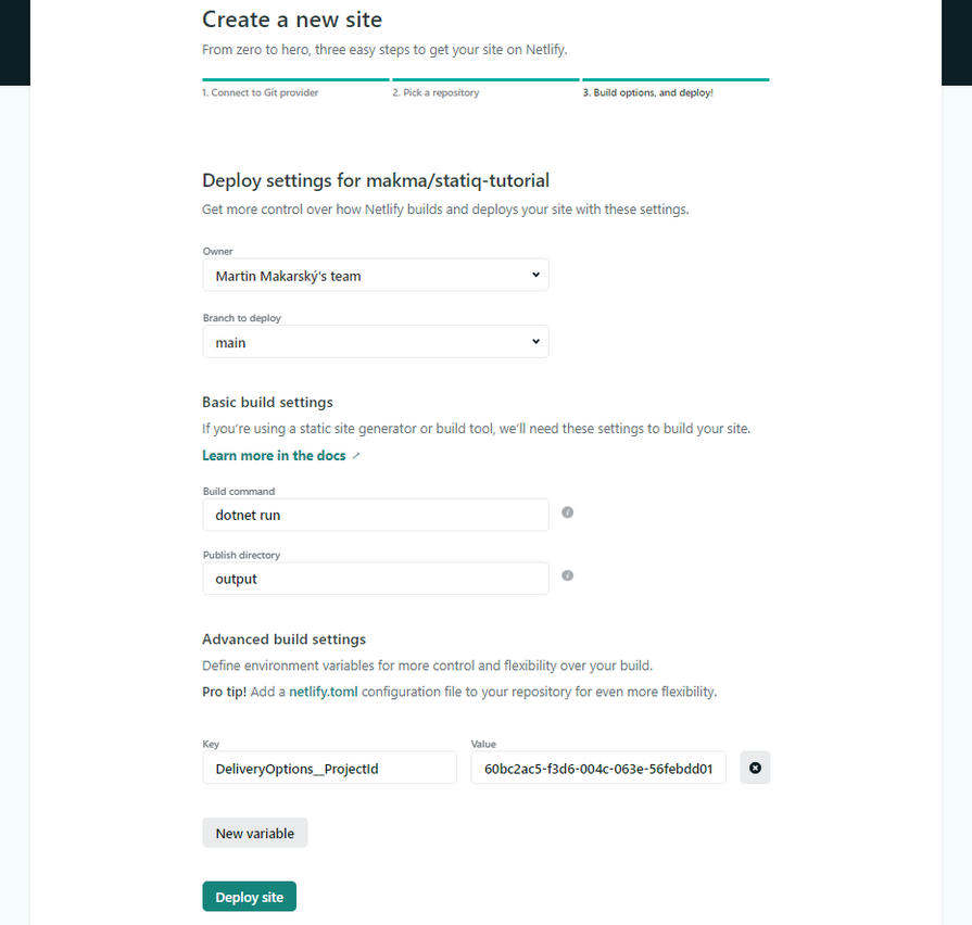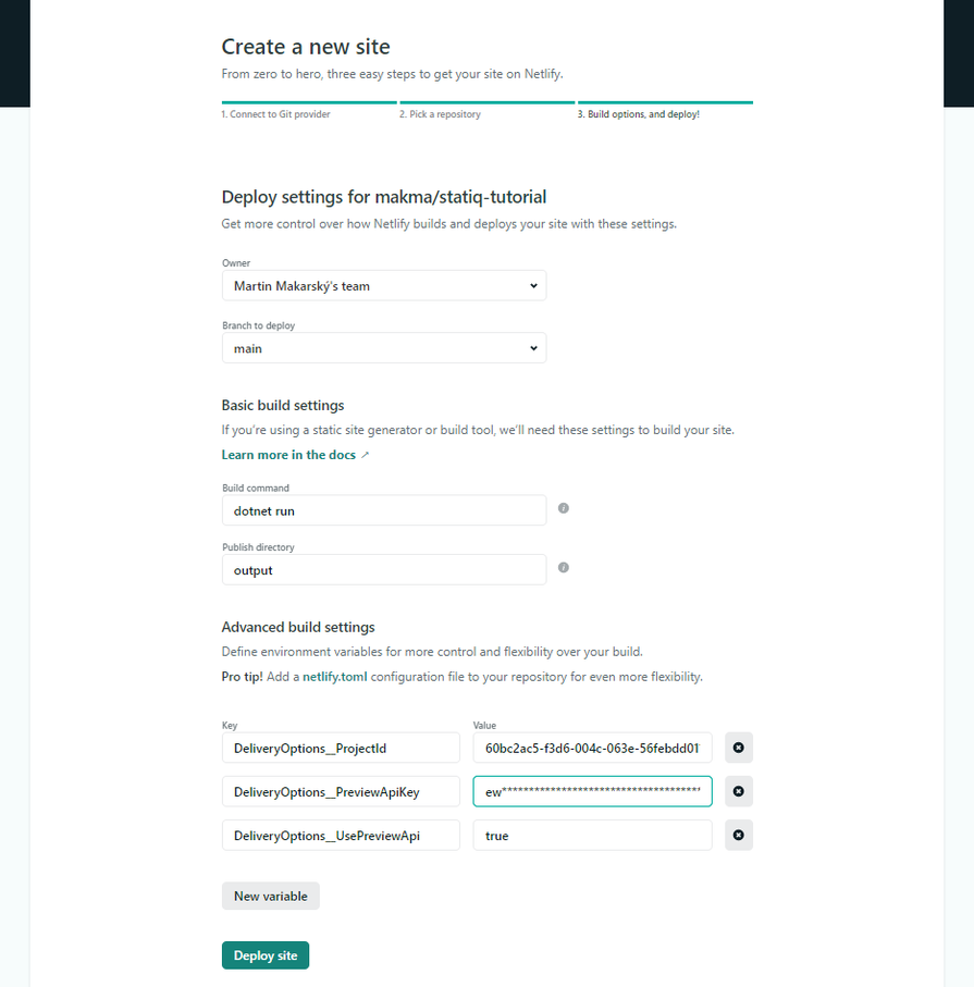 appsettings.json. We will provide these settings in the form of environment variables. If you don’t want to follow all the previous steps, you can fork my repository and start from here.dotnet run as a Build command and output as a Publish directory. Add a new DeliveryOptions__ProjectId variable and enter your projectId. Note: Netlify uses double underscore (__) as the delimiter for the nested environment variables.DeliveryOptions__ProjectId add two new environment variables DeliveryOptions__PreviewApiKey with your Preview API Key value and DeliveryOptions__UsePreviewApi with true value.Pro tip: Add webhooks for rebuilding your site when content is changed. You can learn more about Kontent webhooks and Netlify build in this article.