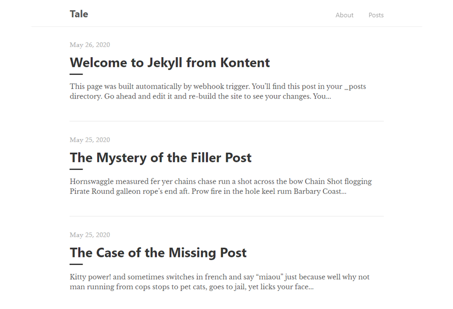 For demonstration, we couldʼve built the whole site from scratch, nevertheless, this article is not about the specifics of Jekyll, Hugo, or Next.js, so I've chosen an already existing blog template from https://jamstackthemes.dev (a very good source of inspirational templates, indeed!). This page is built with Jekyll. Having said that, the same principles would apply for the Hugo or Next.js target plugins and sites.