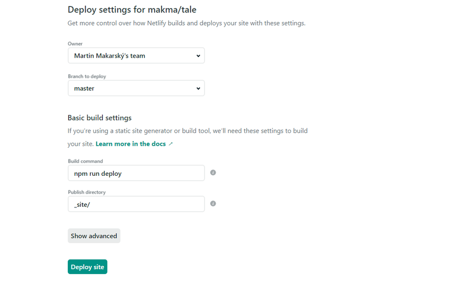 "deploy": "npm install && sourcebit fetch && bundle install && bundle exec jekyll build". This will install all the necessary dependencies, fetch and normalize all the data, and build Jekyll site.2.6.2.baseurl from _config.yml.master branch to deploy, enter npm run deploy as build command, _site/ as publish directory, and deploy the site. After a successful build, your site will be deployed and publicly available on Netlify.Now weʼve got our site deployed with the content that is not hardcoded but fetched dynamically from the CMS. However, when the content is updated in the CMS, changes are not reflected on the deployed site yet. To achieve this, we have to trigger a new Netlify build once the content is changed in the CMS.