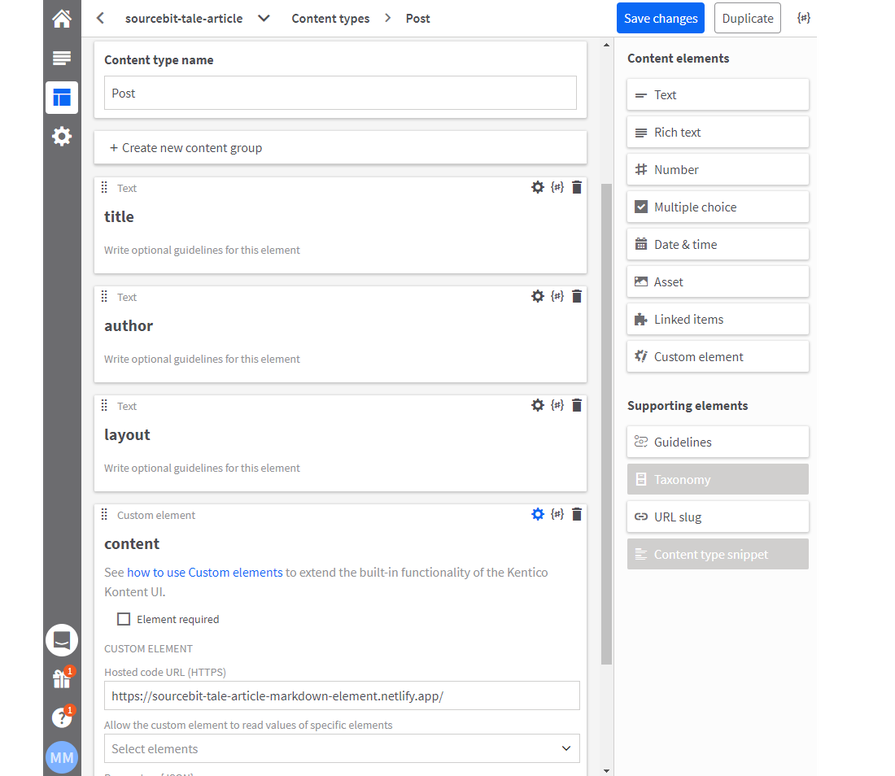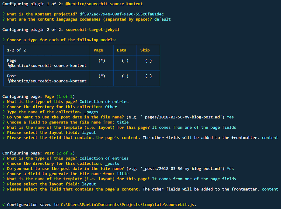 git clone https://github.com/<your_handle>/tale.git.https://sourcebit-tale-article-markdown-element.netlify.app/ or fork the original repository and deploy it to Netlify. (You can learn more about custom elements in documentation for kontent.ai.)npx create-sourcebit command to start the interactive command-line configuration. You can move between items with your arrow keys, selecting the option with the Space bar, confirming with the Enter key.@kentico/sourcebit-source-kontent (by Kentico): A Kontent source plugin for Sourcebit and confirm.sourcebit-target-jekyll (by Stackbit): A Sourcebit plugin for Jekyll target plugin and confirm.default language and confirm.After finishing the interactive wizard, note the newly created file named sourcebit.js. This is a config file for Sourcebit that defines how to fetch, transform, serialize, and use the content. Once you change the structure of your project or data in your CMS, you can walk through the interactive wizard again to generate a new config, or you can just edit this file. The whole Sourcebit configuration is also in a .gif provided in the Smooth Configuration section.